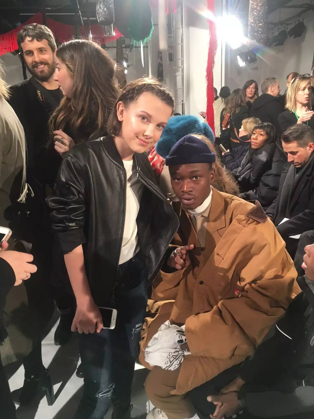 美国演员Ashton Sanders也和清新美女Millie Bobby Brown一起出现在Calvin Klein的秀场上,看Ashton Sanders在美女身边紧张的神色,不愧是美女的护花使者。此外,Ashton Sanders穿着一身6、70年代复古风格的皮衣,带着小圆帽,好看极了。