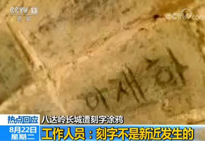 中国长城学会副会长 董耀会:特别小的一个行为,使得长城就没法修了,专家想去掉,也去不掉,因为刻得那么深,如果把它磨掉的话,那长城砖就被破坏了,如果抹上一层盖住,那长城整个的风貌又被破坏了,所以说就没有办法处理。