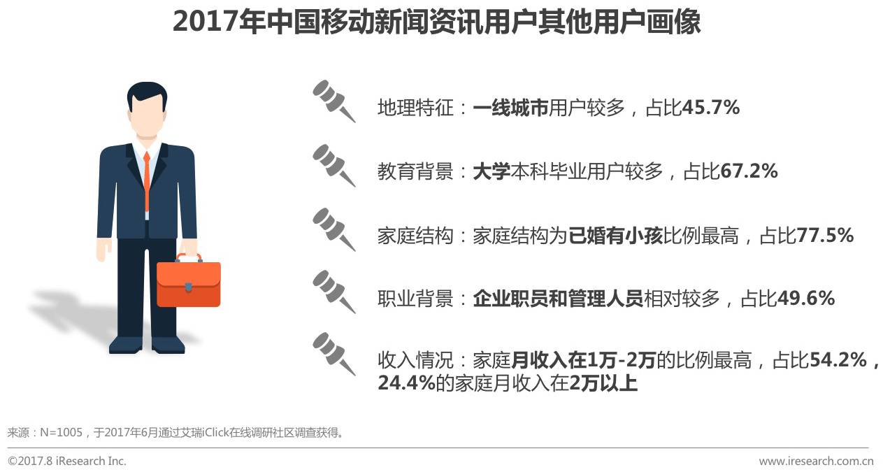 根据调研,样本中新闻一线城市用户占比45.7%;教育背景集中在本科,占比67.2%;家庭结构为已婚有小孩得比例最高,占比77.5%;职业背景以企业员工和一般管理人员为主,占比49.6%;家庭月收入集中在1万-2万,占比54.2%。分析发现,本次调研所描摹的移动新闻资讯用户近似工作于一线城市的白领人群,仍处于成长阶段、价格敏感度较高、对待新鲜事物有一定好奇心、计划消费的同时也有一定购物欲望。