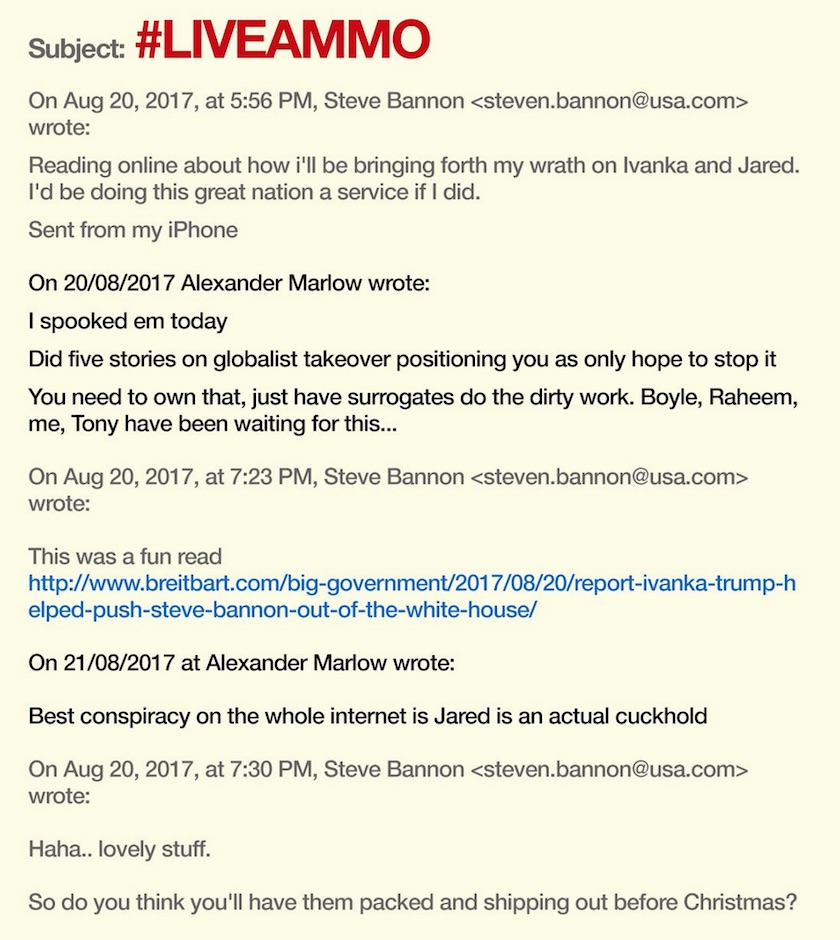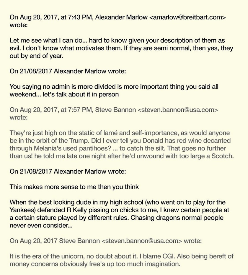 CNN从这位自称“邮件恶作剧者”那获得了双方的邮件往来。在这些邮件中,布赖特巴特总编辑马洛(Alex Marlow)承诺,他和其他高级编辑和记者将替班农做那些“不干净的活儿”(dirty work),打击在白宫与班农不和以及被他们视为“全球主义者”和民主党人的特朗普高级助手。