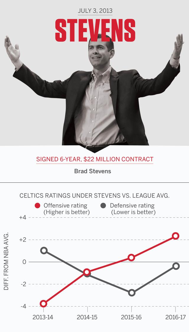 2013年6月,凯尔特人不敌尼克斯止步季后赛首轮后,便果断开启了漫长的重建之路。凯尔特人送走了加内特、皮尔斯,也送走了功勋教练道格·里弗斯。随后,凯尔特人总经理丹尼·安吉聘请了巴特勒大学的年轻教练——布拉德·史蒂文斯作为凯尔特人的新主帅,双方签订了一份6年的合同。