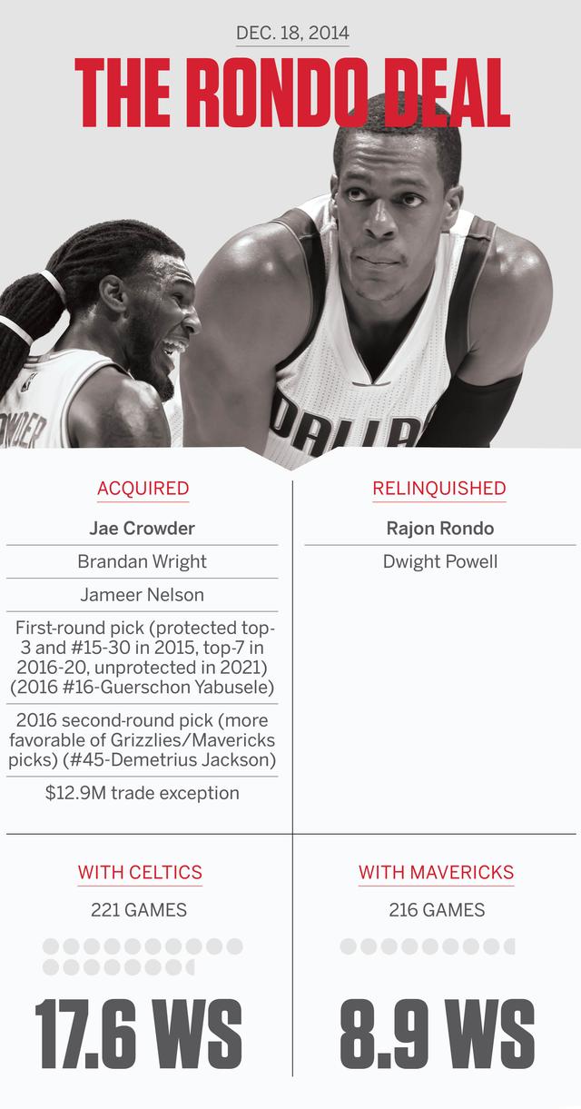 在隆多担任凯尔特人队长还不到1年时,安吉便出人意料地在该年12月将他送到了达拉斯。在此次交易中来到凯尔特人的克劳德在球队中发挥着重要作用。2015年,克劳德跟绿军续约,签下一份5年3500万美元的合同,成为了NBA最有价值的球员之一。而加盟达拉斯后隆多的状态却越来越差,赛季结束后,达拉斯便让他走人。