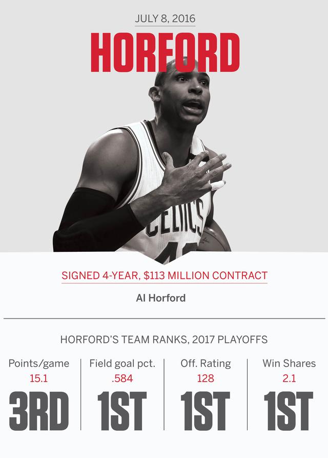 安吉抛出的橄榄枝让艾尔·霍福德以一份4年1.13亿美元顺利签约,凯文·杜兰特在签约金州勇士之前,也认真考虑过凯尔特人,不过还是选择了勇士。这个赛季,绿军取得了令人惊喜的53胜29负的成绩,排名东部第一,联盟第四。可惜的是,小托马斯因为臀部受伤而提前结束了比赛。
