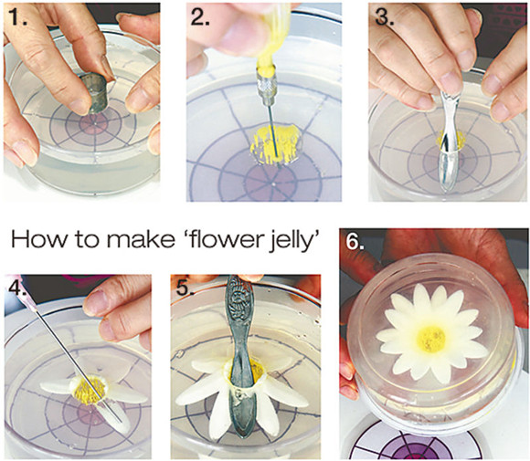 当然,你可以在超市买到不同花瓣状的特殊勺子,这样你就能制作出樱花、菊花、玫瑰、康乃馨等等的花了。如果你想用可食用的花瓣,那就更简单啦,直接把花瓣放进果冻进行冷藏。