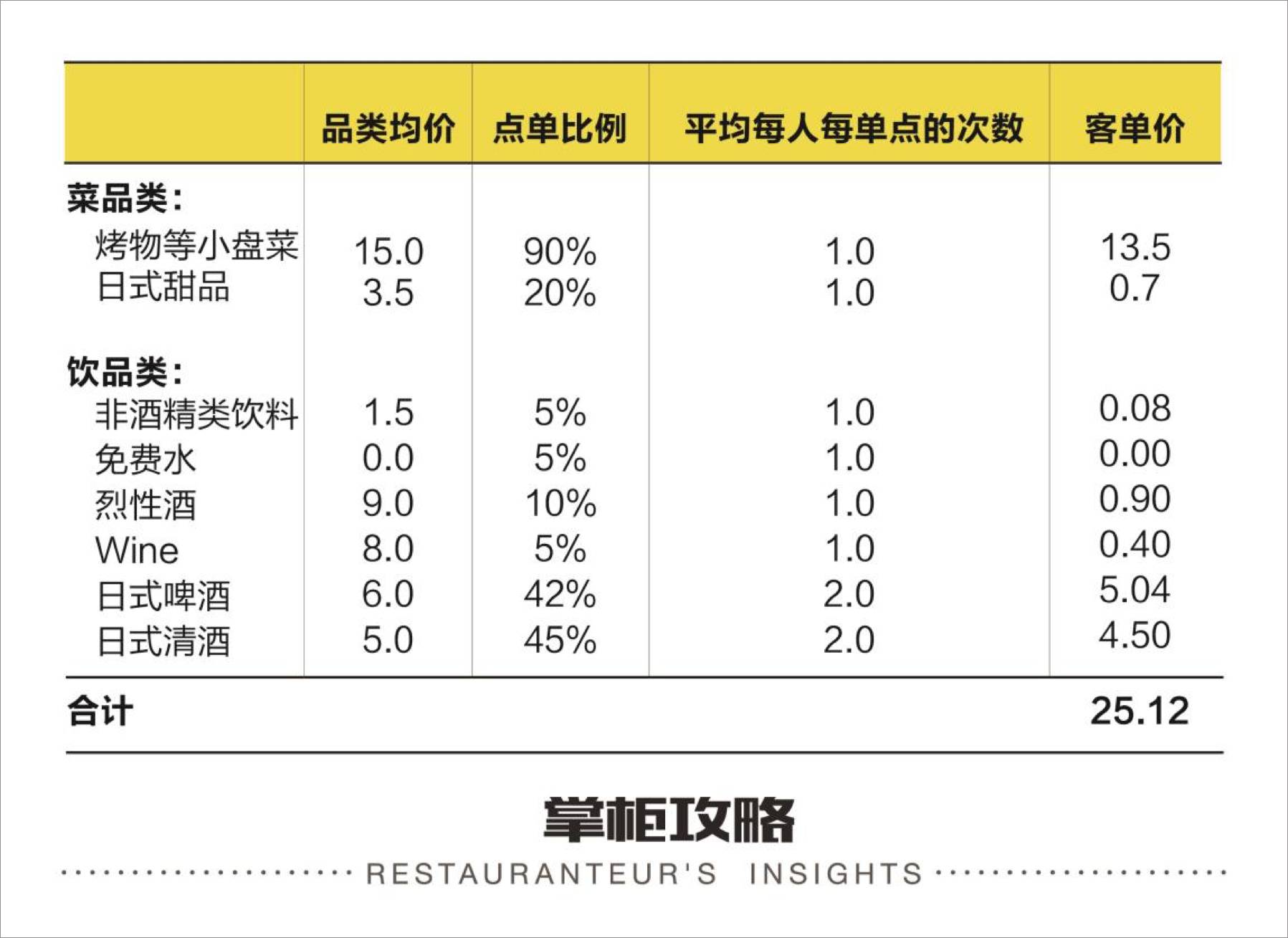 上表中的 “品类均价” 由菜单的定价决定,“点单比例” 则意为顾客中点此品类的比例。这家日式居酒屋主营菜品是烤物类的小盘菜,于是店主预估90%的顾客都会点此品类中的菜品。“平均每人每单点的次数” 就是这90%的客人平均每人每单会在“烤物小盘菜”品类下点多少菜品。最后将“品类均价” “点单比例” 和 “平均每人每单点的次数” 三者相乘,得出各个品类的客单价,全部品类的客单价之和即是总客单价。