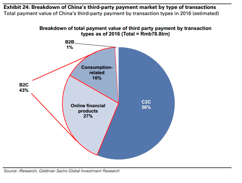因此,高盛认为,在中国第三方支付行业2016年的11.4万亿美元交易规模中,仅占交易量16%的1.8万亿美元B2C消费转账成为第三方支付公司未来最主要的利润基础。