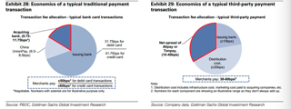 随着微信加入阿里的线下争夺,双方对签约商户的竞争日渐激烈。对第三方支付公司来说,提供回扣或高支付聚合器来吸引更多商家,降低费率成为惯用的推广方法。高盛认为,由于高度竞争的市场环境,对于大多数第三方支付公司来说,从支付手续费中获得的利润十分稀薄。