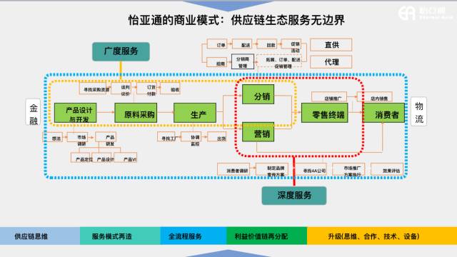 从上图可以看到,怡亚通首先强调的是供应链思维,是以竞争态势强调共荣共生。也就是说,企业首先要强大,并在强强联合当中实现共荣,然后是服务模式再造。通过全流程服务去实现价值链的再分配,从而达成思维升级、合作共赢,以及技术、设备的共享。