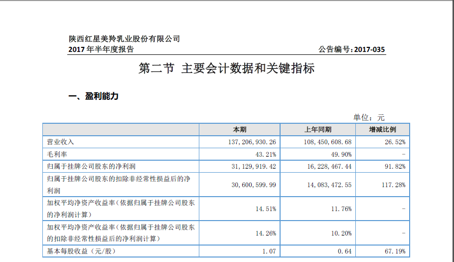2017年上半年,红星美羚实现营业收入约为1.37亿元,和2016年同期1.08亿元相比,增幅在26%以上;归属于挂牌公司股东的净利润接近3113万元,相较于2016年上半年不到1623万元,增幅在92%左右。