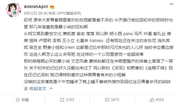 “笛安、落落、肖以、胡小西、七堇年、hanse,还有现在还在关注的安东尼、消失宾妮、吴忠全、野象小姐和小kim,这都是记忆中那时闪闪发光的人儿呀。”一个最小说的忠实粉丝回忆着,“原来大家青春期里喜欢的东西都是差不多的。”她这条“午觉睡多了晚上睡不着”而发出的碎碎念,也获得了将近1万次点赞。