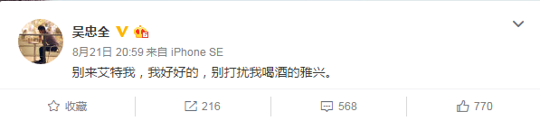 主动出来“报平安”的是hansey、Kim和吴忠全。曾与郭敬明因为理念不合而分道扬镳的hansey,后来还是回到了最世文化,“我很好,谢谢你们,”他答得云淡风轻。而作为一个表面冷漠内里暖的东北摩羯汉子,吴忠全的回复更为硬朗:“我好好的,别打扰我喝酒的雅兴。”
