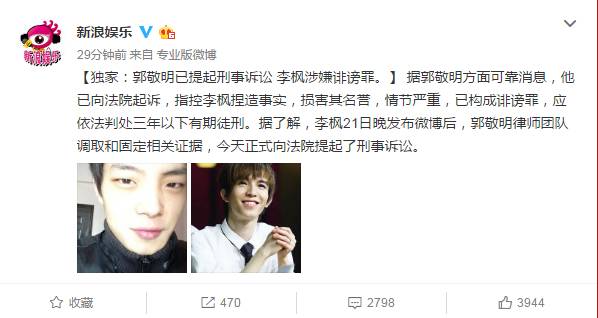 这件事的波及到底有多大?反正一位文学圈内的朋友苦笑着告诉笔者,“你厂旗下的签约男作者还好吗?”如今成为了大家的日常问候梗。今天下午新浪娱乐放出消息称,郭敬明方面已向法院起诉,指控李枫捏造事实,损害其名誉,情节严重,已构成诽谤罪,应依法判处三年以下有期徒刑。