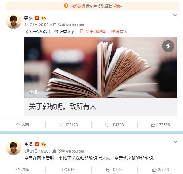 这一切都要归功于8月21日晚上作家李枫接连发出的几条微博。“上过床”、“性骚扰和性侵犯”、“淫乱的世界”这些犀利字眼不仅扎了另一位“当事人”郭敬明的心,也让看最小说长大的一批人目瞪口呆。