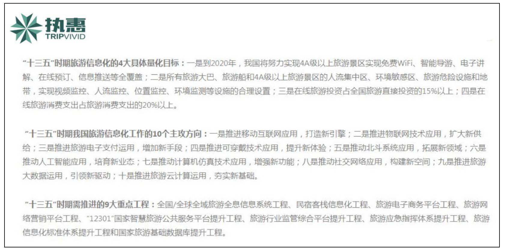 2017年3月7日,国家旅游局公布《“十三五”全国旅游信息化规划》。规划提出到2020年旅游信息化发展目标,即信息服务集成化、市场营销精准化、产业运行数据化、行业管理职能化,并明确了旅游信息化的4大具体量化目标、10个主攻方向、9大重点工程。
