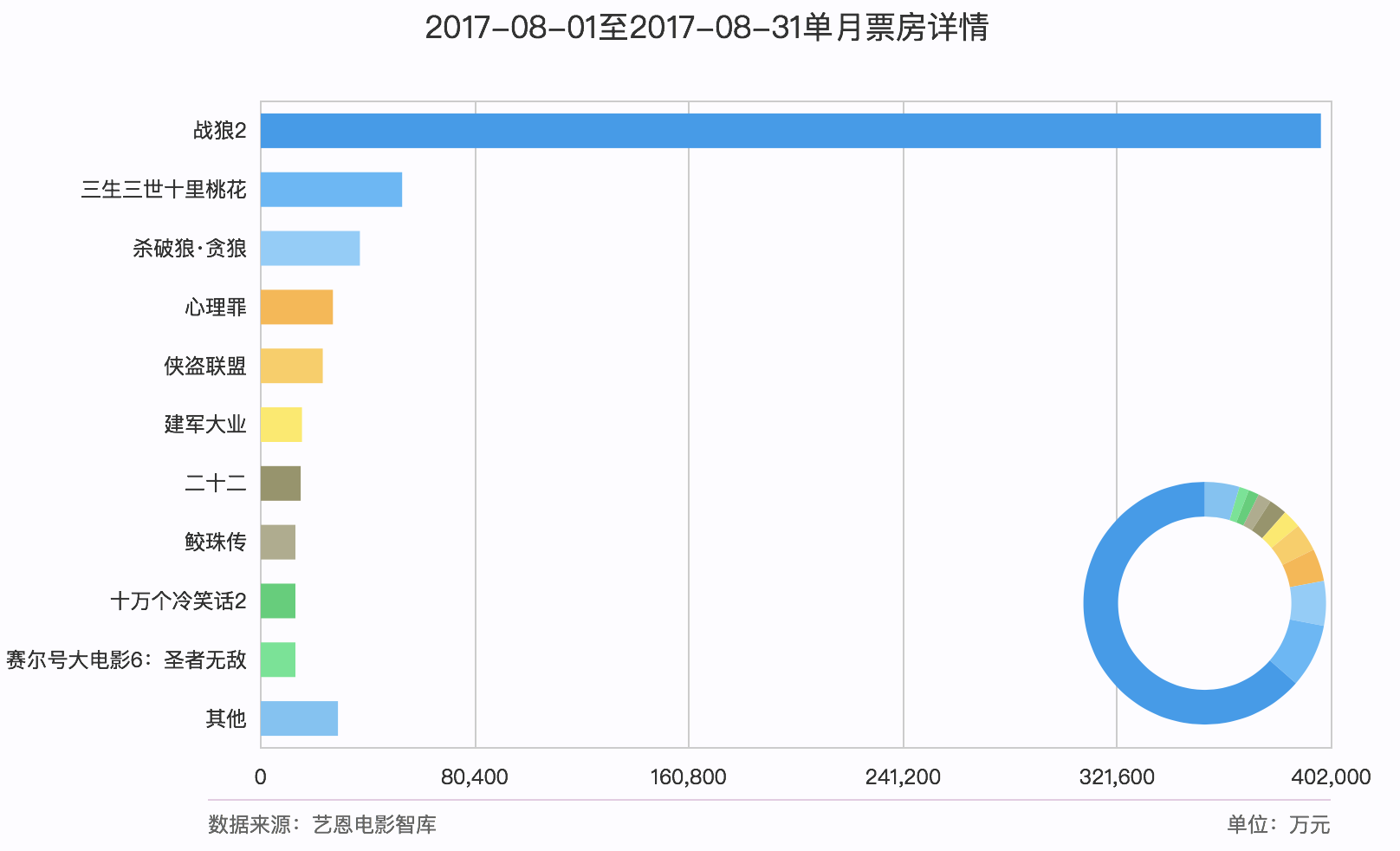 这一高一低的对比显示出院线对观众观影热情的准备不足,同时也明显低估了《战狼2》超强的“续航能力”。尽管八月的国产新片数量众多,但三十多部电影仅仅贡献了不到40%的票房,而在7月末强势登场的《战狼2》,一直将战火延续到了整个八月,单月拿下近40亿票房令人瞠目结舌,如此惊人的单片单月票房,甚至超过了3、5、6月的单月整体票房,几乎是以一己之力拉高了八月的整体票房成绩。