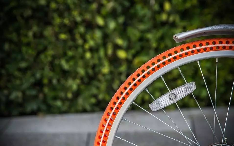 摩拜单车轮胎采用了“横向镂空加强筋”设计。这种轮胎说是防爆,不用充气,缓震性能好还能回收利用,而且还申请了专利!