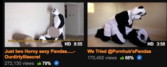 业界良心pornhub决定出手相助!号召用户们上传人类穿着熊猫服装头套的性爱录像,供动物学家挑选。被选中的录像会给熊猫们观看,帮助他们进入"状态"。并且pornhub会根据视频点击数给熊猫保护公益组织捐款。