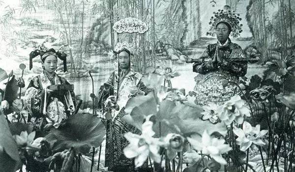 右边是李莲英扮的善财童子,左边是一个格格扮的龙女,中间唯一没看镜头的那个是慈禧太后