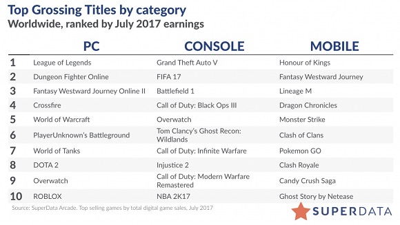 7月PC端《英雄联盟》夺冠,紧接其次的为《地下城与勇士》、《梦幻西游2》和《穿越火线》。《英雄联盟》登榜首似乎在情理之中,八年来,该游戏已吸引了全世界的玩家。而腾讯代理的其他两个游戏《地下城与勇士》和《穿越火线》也获得了不俗的成绩。《梦幻西游2》虽然主要市场在国内,但凭借中国庞大的玩家群,它依旧占领了PC端收入第三。