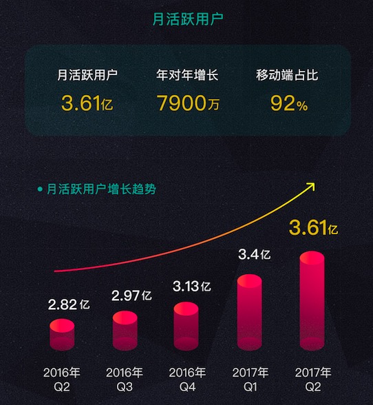 微博用户活跃度的上升自然带来营收和广告的增长。根据微博2017年8月发布的Q2财报,微博目前的月活已经达到3.6亿,且90%以上都是在移动端。微博用户规模继上一季度首次超越Twitter后,再次领先社交媒体行业,目前成为仅次于Facebook和腾讯的社交应用,稳固了第三大独立社交公司地位。