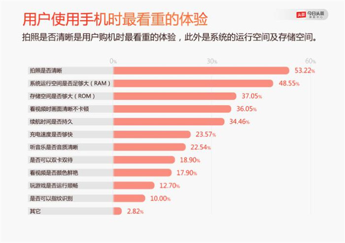 据今日头条算数中心发布的《2016年度手机报告》统计,用户购机参考元素愈趋多元化,如拍摄效果、系统内存、视频流畅度、续航等等,这些多元化需要越来越容易左右用户的选择。如果说以往千元机瞄准了换机用户“尝鲜”的痛点,而在新时期已经是“老司机”们的用户购买选择时参考的点将更丰富。