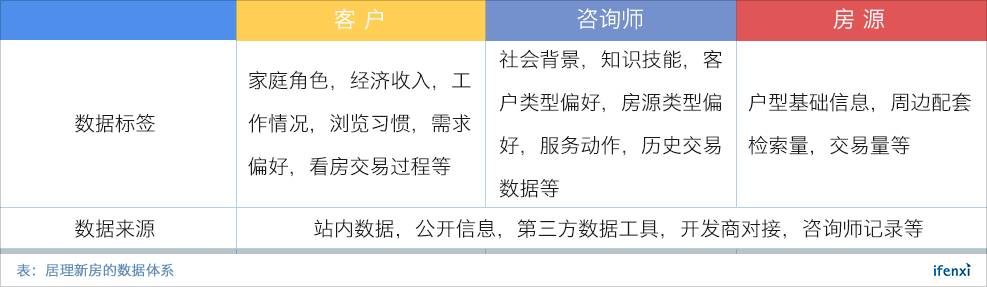 在从线上到线下的客户获取和服务流程中,客户的社会属性、需求属性和行为数据等标签,都可以反馈到系统中。房源数据主要来自公开信息、开发商对接,以及咨询师线下搜集,数据标签包括房屋基础信息、配套设施以及成交和检索情况等。咨询师在服务过程中,也在不断积累数据。