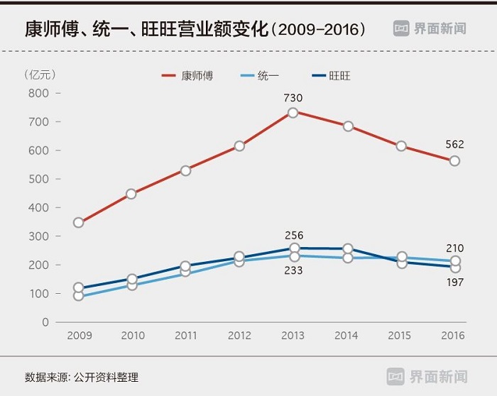 很长时间里,康师傅、统一、旺旺这些来自台湾的食品企业在产品本身和渠道流通上都扮演着引领的角色。 但是如果从三家公司上市后可以查到的2009年到2016年的财务数据比较,会发现它们的下滑从2013年已经开始。