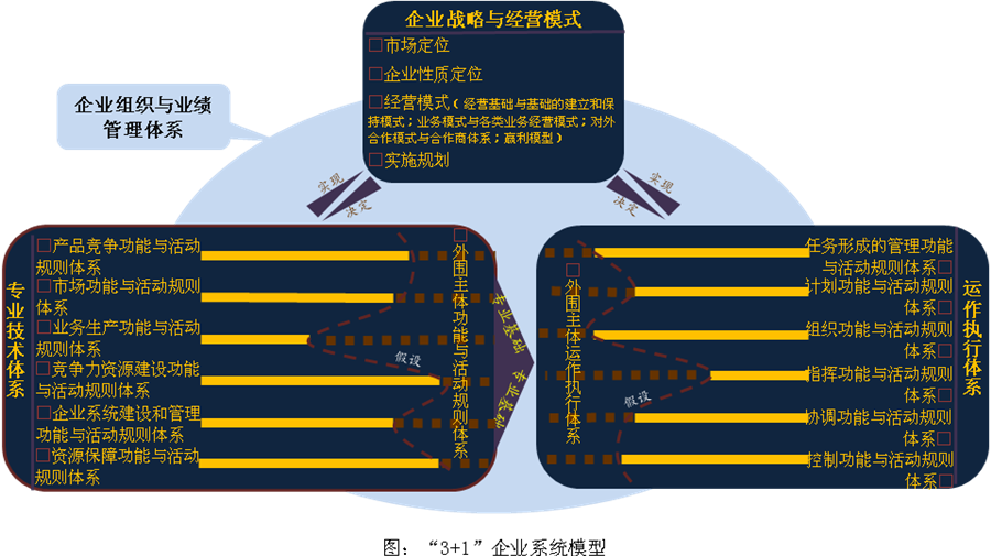 企业系统,从构造原理上区分为4个体系(准确的说是4种成分):有3个体系构成的企业经营体系,和1个企业组织与业绩管理体系。上海智栈企业管理事务所将之命名为“‘3+1’企业系统模型”。见下图。