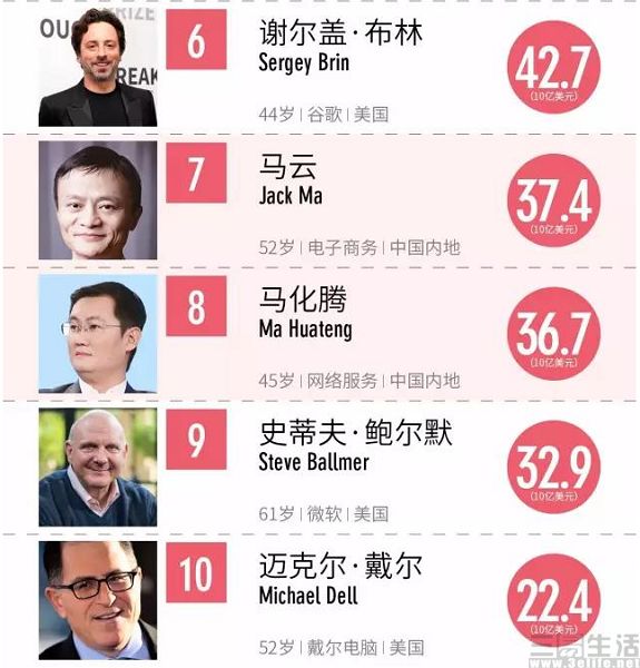 不过在榜单的前十里面,除了一溜发际线堪忧(或者干脆没有头发)的美国富豪,我们还发现了两位来自国内的大佬——马云、马化腾。