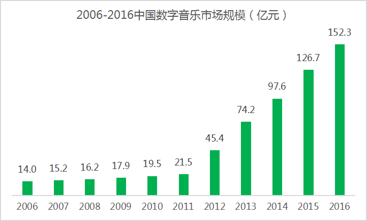 根据腾讯研究院近期发布的测算,2016年中国网络核心版权产业的行业规模为5086.9亿元人民币,同比增长31.3%。其中,在版权保护以及移动体验不断完善的背景下,我国数字音乐产业实现了高速发展,相比2006年,2016年中国数字音乐产业的行业规模增加了10倍,突破150亿元,与美国的差距正在逐年缩小。