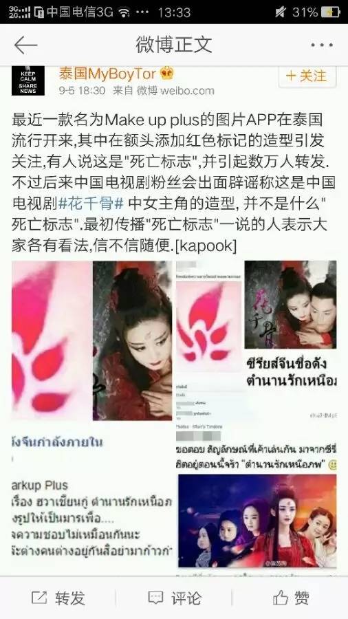 2015 年“现象级 IP 剧”《花千骨》在泰国热播期间,几乎一夜之间,泰国社交媒体画风突变,形形色色青年男女不约而同地使用一款“makeup”肖像处理软件,把自己的照片处理成“妖神妆”。