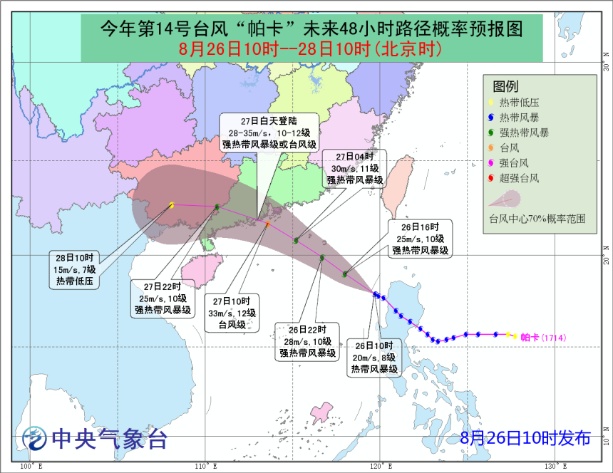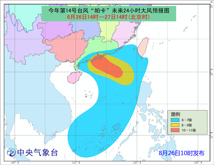 大风预报:26日14时至27日14时,南海大部、巴士海峡、台湾海峡以及广东沿海、福建南部沿海将有6-7级大风,其中,南海东北部海域及珠江口区的风力将有8-9级,“帕卡”中心经过的附近海域或地区的风力可达10-12级,阵风可达13-14级。
