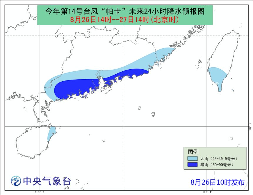降水预报:26日14时至27日14时,台湾南部、福建东南部、海南岛东北部、广东南部、广西东南部等地的部分地区将有大雨或暴雨(50-90毫米)。
