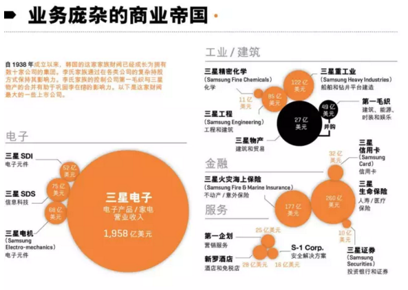 这段企业历史要追溯到大约80年以前,李在镕的祖父李秉喆在1938年创办了一家食品贸易公司。今天,这家财阀拥有67种不同的产业,产品包括服装、游乐园、造船、洗衣机、金融服务等。由于在智能手机、内存芯片、电视机这些庞大产业当中处于领先地位,三星电子是目前这家联合大企业最重要的板块,占到总营业收入的三分之二,利润占比甚至更高一些。
