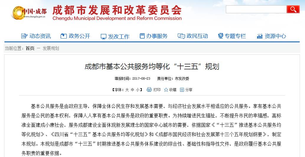 8月23日由成都市发改委牵头制定的《成都市基本公共服务均等化 “ 十三五 ” 规划》已正式印发。