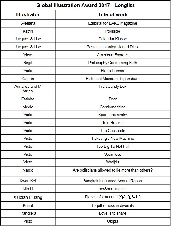 第二届全球插画奖(Global Illustration Award)日前公布了入围作品长名单。评委会按照“一般图书类”、“原创未出版儿童绘本类”、“社论与广告插画类”、“科普插画类”和“主题插画类”5个参赛类别,从来自45个国家的5000多幅参赛作品中投票选出了95部作品入围。短名单及最终获奖结果将在今年10月法兰克福书展上宣布,首奖奖金为6000欧元。