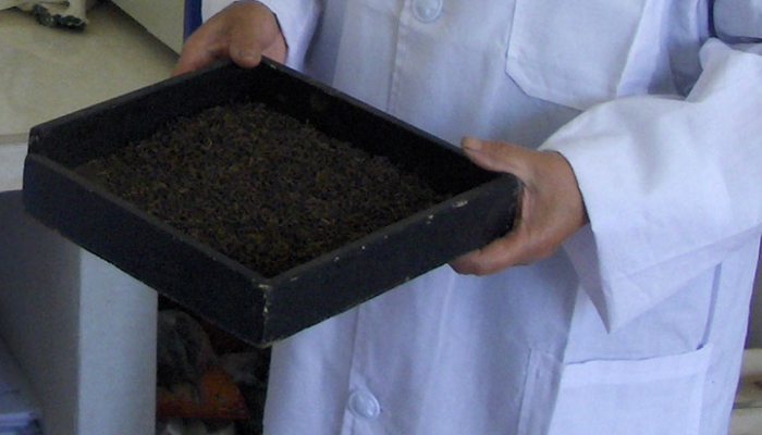 普洱熟茶的发酵,对体量和技术的要求都非常高,数吨的茶渥堆发酵,要持续两月余。根据茶菁的老嫩、发酵时的温度、湿度、发酵的场地来洒水,不时的测量堆温,堆温到什么程度翻堆要凭借经验来掌握。