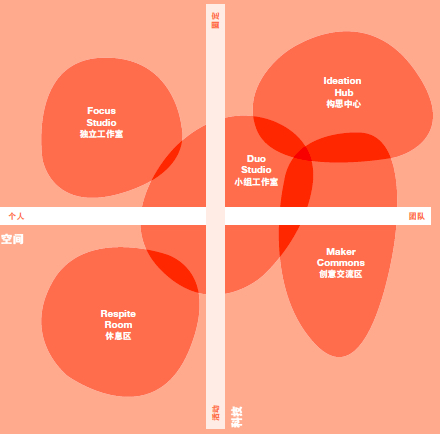 “我们很多人的一个普遍认知是,创造力是在团体中产生的,比如说一支团队开发创新产品,或被公司要求解决一个棘手问题。很多情况下的确如此,所以我们设计了创意交流区和构思中心,它们就是为了一组人能够聚在一起从事这样的创意生成活动,”Armbruster说,“但我们同样认为,创意不是一个线性的过程,你需要人与观点的聚合,也需要人与观点的离散。创意的过程往往是在以团队为单位合作后,成员进行单人工作,然后带着自己的新观点回到团队之中。我们认为很重要的一点是办公空间的设计不能只照顾团队工作,我们也需要能够让个人工作、思考和反省的独立工作室。即使你和团队成员待在一起,你在休息区休息、恢复精神的时候也有可能会有新主意突然闪现。因此,创意空间将所有这些方面都考虑进去,其设计是为了支持创意活动打造一整个空间生态系统。”