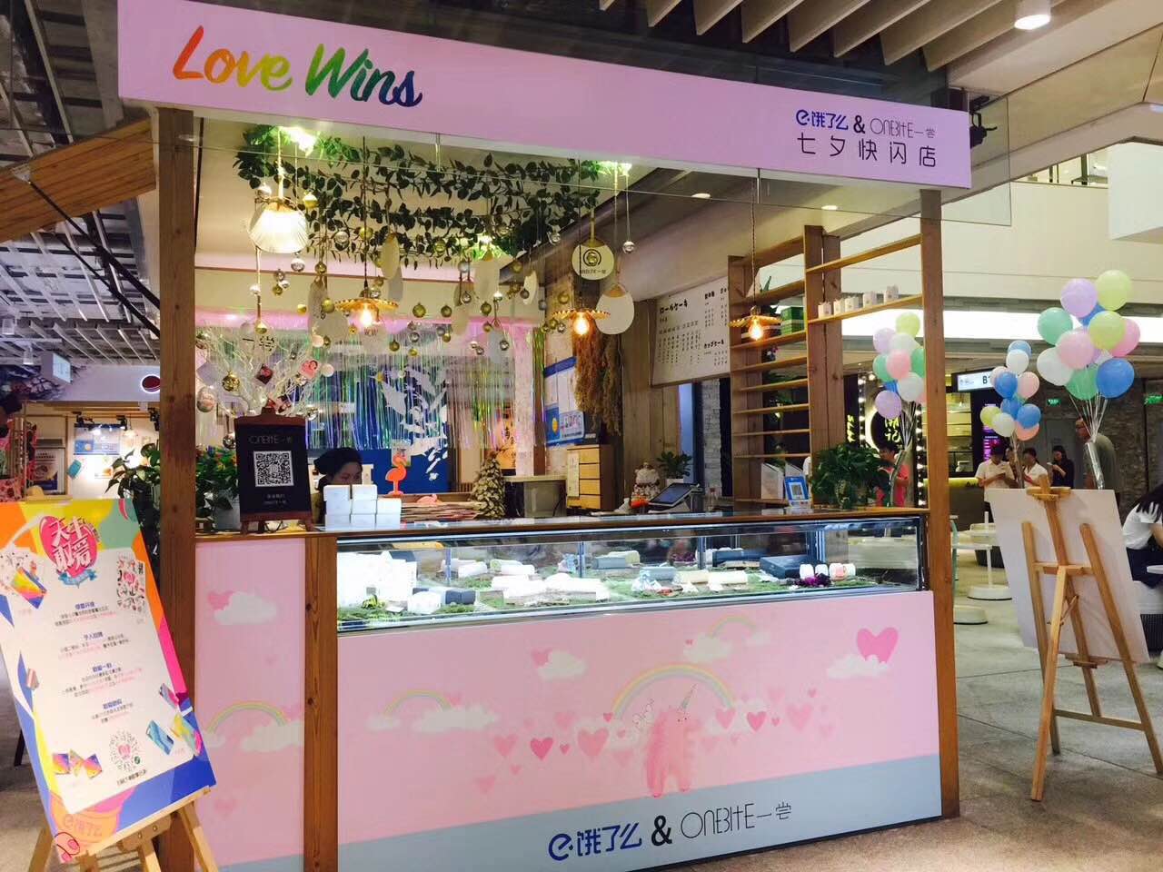 不仅仅是零售商,许多和“送礼”没什么关系的品牌也在趁机寻找追热点的方式。比如最近热衷品牌升级的饿了么,它找来北京、上海、广州三家网红甜品店,推出了“天生敢爱”的主题快闪店。