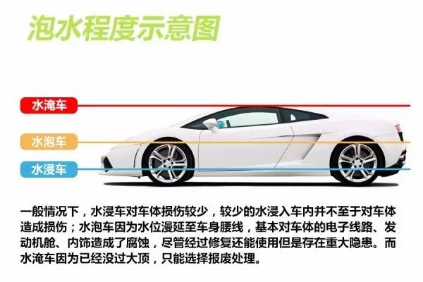 简单通俗的来讲,泡水车就是涉水车,而且以涉水的不同程度来进行划分,总共分为三个层次:水浸车、水泡车、水淹车。