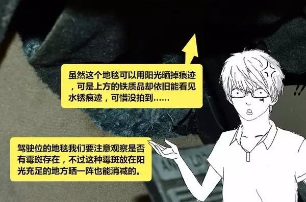 泡水检查主要在于四个基本现象:锈迹、霉斑、泥沙和水渍。其中锈迹是最容易被发现的,其次是霉斑,而泥沙和水渍,如果是修复翻新过的车辆,这两点很容易被掩盖或者清理掉,但是即便是如何修复,都不可能尽善尽美,所谓检查泡水车,就是比较谁更细心,谁更认真。