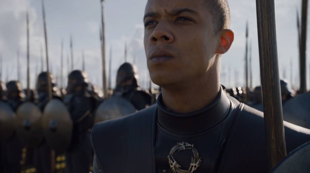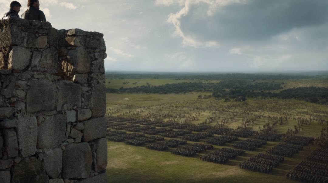 詹姆和波隆在城墙上远眺无垢者和多斯拉克大军。尽管龙妈失去了一些盟友,但她的军队看起来仍然十分强大。