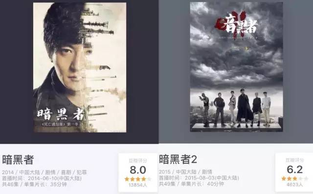 如《暗黑者》讲述了一群性格各异但心怀正义的警察组成的专案组与神秘暗黑者斗智斗勇的故事。其第一季最大的优势,就是人物个性鲜明、剧情紧凑,但到了第二季,人设崩塌、故事情节啰嗦无趣、强行植入广告、群演尴尬等问题层出不穷。因此在第二部播出后,原著小说作者周浩晖也忍不住吐槽,“对于《暗黑者》第一季,我曾给过形散神不散的评价,现在的第二季呢,我觉得那是一只彻底脱线的风筝”。最终,虽然凭借第一部的热度为第二部引流增加了播放量,但口碑却从8.0跳水至6.2。