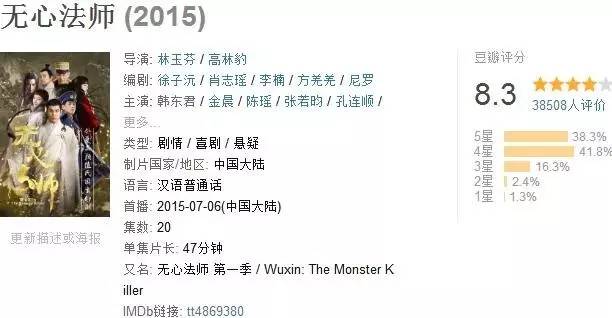 同时,在目前热播的知名网剧中,《无心法师》的口碑也一直居高不下,在豆瓣社区有38000多人参与评价,评分8.3,可谓是同类型网剧中首屈一指。