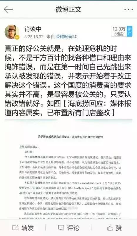 海底捞的公关一如既往的“超预期”,我又忍不住在微博评论:越来越好的公关就是,不甩锅给门店一线员工,没有所谓“临时工”背锅,而是公司高层直接承担责任。