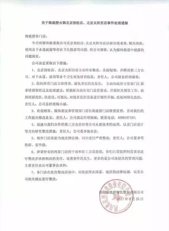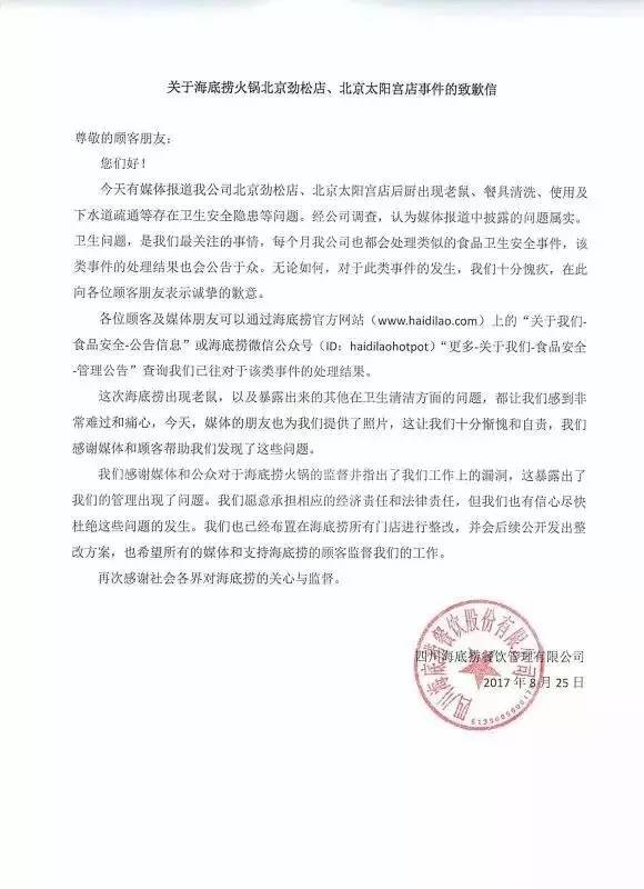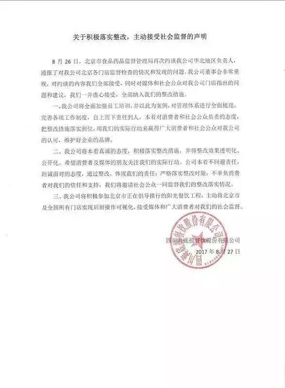 8月27日下午,海底捞又发声明:对于北京食药监的约谈内容全部接受;同时将媒体和社会公众指出的问题和建议,全部纳入整改措施。