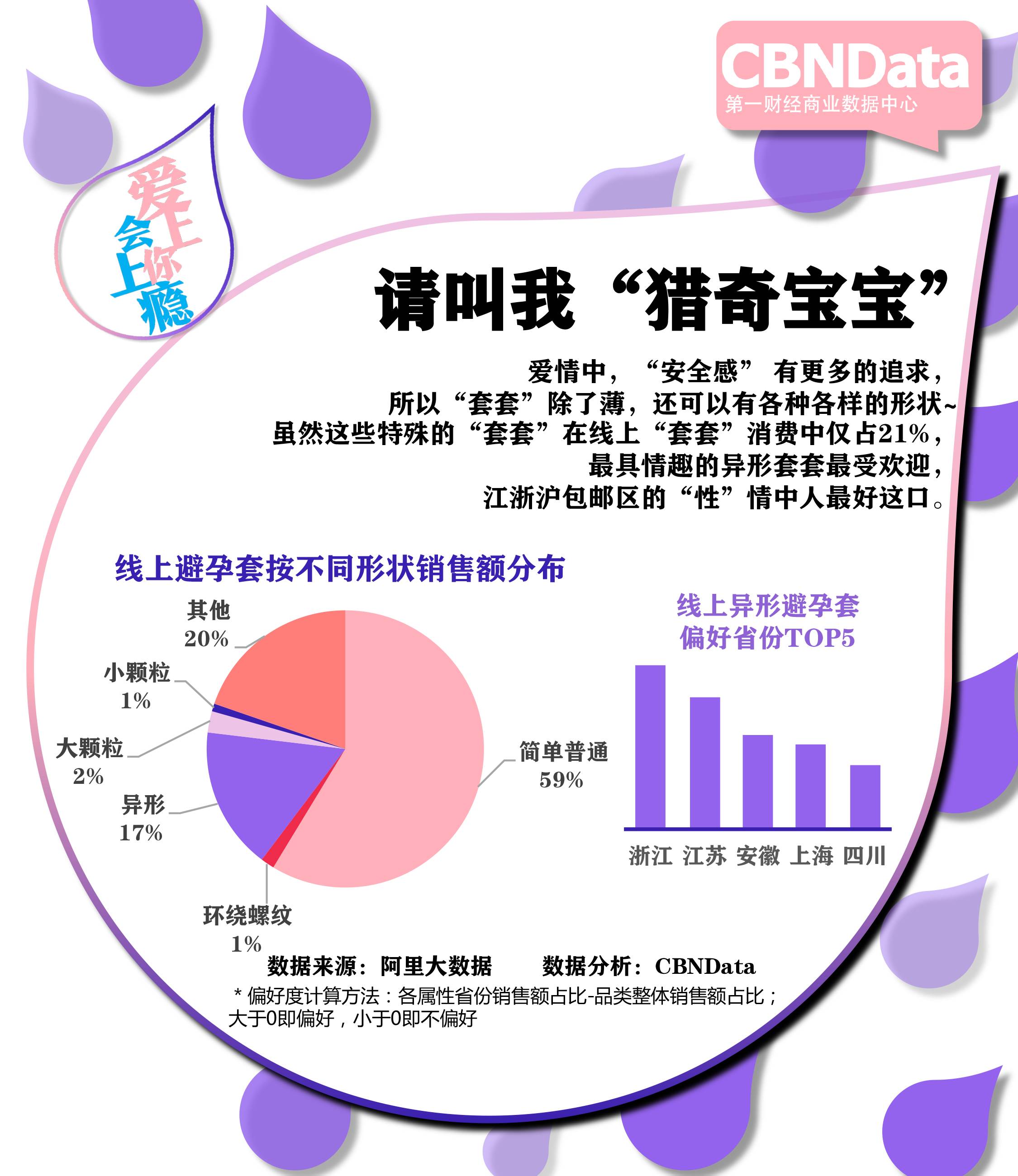 在此前CBNData发布的《爱上你,会上瘾》(即《2017线上计生用品相关消费系列研究》,后文简称CBNData《研究》)就曾显示,从避孕套按外观形状的线上销量来看,有近六成的消费者选择简单普通型,但还是有近四成的“猎奇”宝宝们,除了“安全”的舒适感,不忘追求刺激与激情,选择尝试不同形状与体感的避孕套。可见,“情趣”正日渐成为消费者的新宠,对于主打情趣产品的品牌而言,有很大的市场发展潜力。