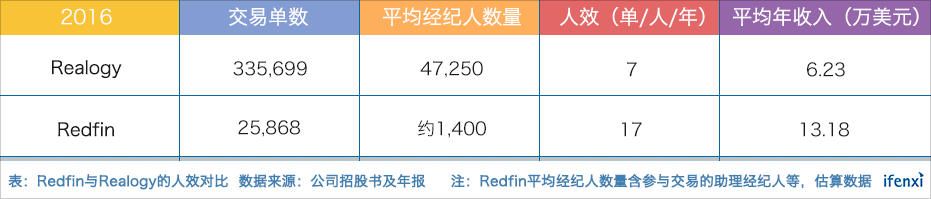 我们以传统房地产经纪公司Realogy(NYSE:RLGY)为例,对比Redfin的经纪人效率,可以看出,Redfin的经纪人人效是传统经纪人的近3倍,而收入是传统经纪人的2倍。