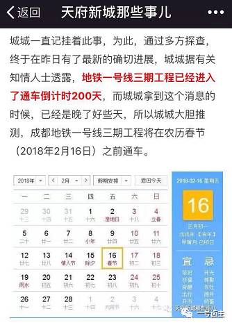 特别是成都地铁1号线北段韦家碾站,在8月25日的“天府新城那些事儿”微信文中称,“成都地铁一号线三期工程已经进入了通车倒计时200天”而且大胆推测,“成都地铁一号线三期工程将在农历春节(2018年2月16日)之前通车”。