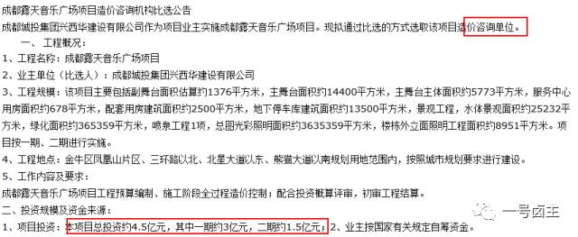 紧接着,8月22日,有媒体公布一则招标公告:《露天音乐广场项目造价咨询机构比选公告》,项目总投资约4.5亿元,其中一期约3亿元,二期约1.5亿元。